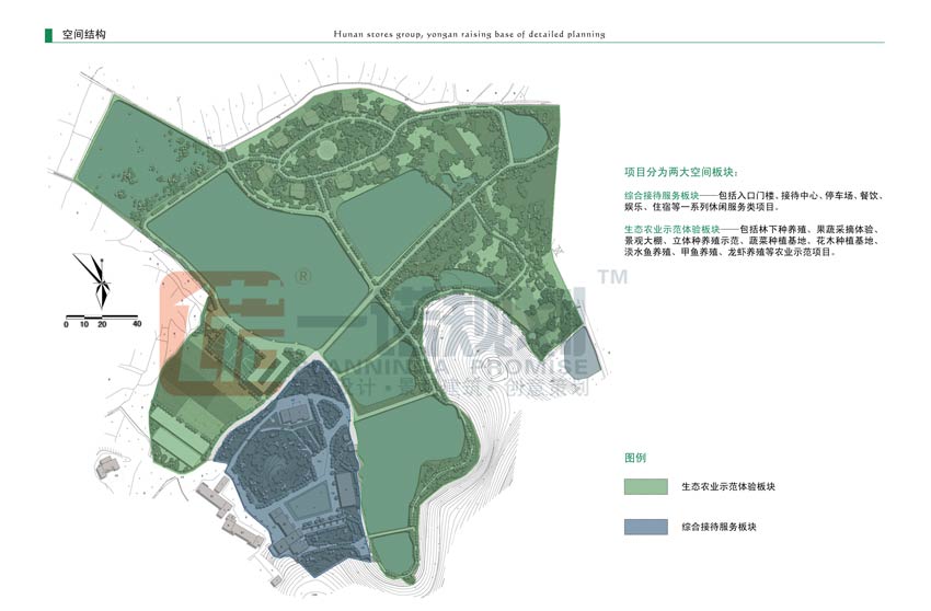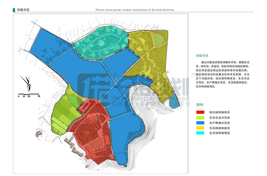 通過對基地資源的調(diào)查和分析,根據(jù)生態(tài)性、特色性、系統(tǒng)性、有機性等空間組織原則,綜合考慮園區(qū)周邊的資源特色和發(fā)展態(tài)勢,結(jié)合規(guī)劃項目的發(fā)展定位和開發(fā)思路,分為五個功能區(qū)塊:綜合接待服務(wù)區(qū)、生態(tài)農(nóng)業(yè)示范區(qū)、水產(chǎn)養(yǎng)殖示范區(qū)、樂活田園體驗區(qū)、生態(tài)休閑度假區(qū)。