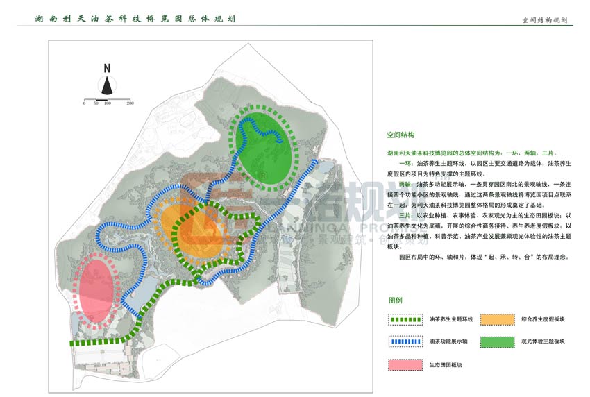 湖南利天油茶科技博覽園的總體空間結(jié)構(gòu)為:一環(huán),兩軸,三片