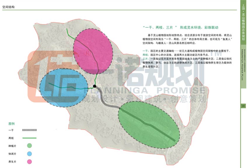 三片:一是指以花卉苗木等各專類園培育為主的產(chǎn)業(yè)種植片區(qū);二是指以依托植物休閑、參與、體驗為主的游憩休閑片區(qū);三是指以植物養(yǎng)生理念為載體的養(yǎng)生度假片區(qū)。