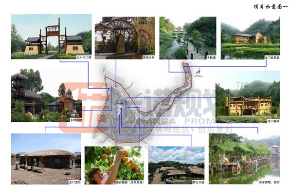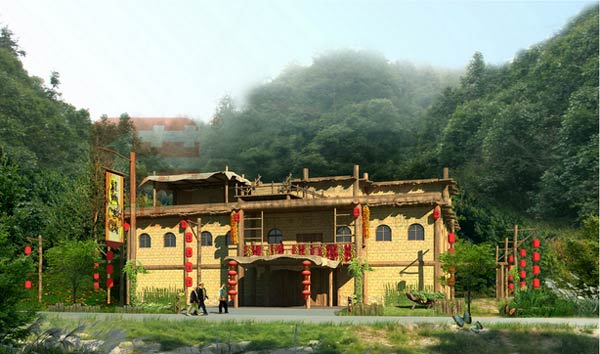 龍門客棧文化區(qū):主要建設(shè)龍門客棧文化景觀(如龍門客棧、龍門酒坊、龍門山莊、龍門別墅等)以及附屬接待設(shè)施,附帶發(fā)展經(jīng)濟(jì)林木種植,品種有果樹(藍(lán)莓、楊梅)以及楠木、紫薇、銀杏等經(jīng)濟(jì)林木;