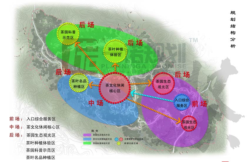 前場為入口綜合服務(wù)區(qū),中場為茶文化休閑核心區(qū),后場為茶園生態(tài)觀光區(qū)、茶葉種植體驗區(qū)、茶園科普示范區(qū)、茶葉名品種植區(qū)四個區(qū)域。