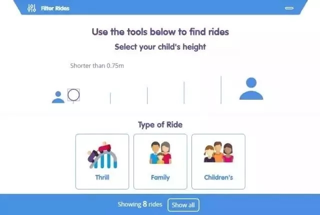 足夠多的設(shè)施是基本盤(pán)!—— 英國(guó)保爾頓斯樂(lè)園、溫莎樂(lè)高樂(lè)園的門(mén)票在30鎊左右(約人民幣255元),提供超過(guò)50項(xiàng)設(shè)施。為了避免“看得到玩不到”、因身高限制敗興而歸,兩家樂(lè)園都在官網(wǎng)寫(xiě)明各設(shè)施的身高限制。其中,保爾頓斯樂(lè)園的查詢(xún)頁(yè)面更人性化,游客只要選擇身高,就能看到可以玩的設(shè)施有哪些,不必逐一點(diǎn)開(kāi)設(shè)施查詢(xún)。入園后還可以在游客中心索取身高貼紙,省去每次乘坐設(shè)施前要重量身高的麻煩。