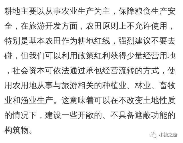 (三)低丘緩坡地:點(diǎn)狀供地,垂直開發(fā) 我國南方地區(qū)的廣大低山丘陵區(qū)擁有大面積的低丘緩坡地,這些土地的利用現(xiàn)狀主要是林地、園地、草地及零星的耕地(基本農(nóng)田),各自所占比例不同。按照利用方式可把它分為宜農(nóng)類、宜林(園)類、宜建類三大類,開發(fā)為建設(shè)用地是低丘緩坡開發(fā)利用的主要方式之一。以浙江德清莫干山裸心堡為例,該項目采取“點(diǎn)狀供地、垂直開發(fā)”的方式,將項目用地分為永久性建設(shè)用地和生態(tài)保留用地,其中永久性建設(shè)用地建多少供多少,剩余部分可以只征不轉(zhuǎn),以租賃、劃撥、托管等方式供項目業(yè)主使用。裸心堡僅新增建設(shè)用地12畝,其余八成的建筑是租用當(dāng)?shù)剞r(nóng)房改造而成,園區(qū)內(nèi)的200多畝山林,從村民手中流轉(zhuǎn),保持原貌,大大節(jié)約了用地指標(biāo)。總結(jié):在現(xiàn)行土地法律制度下,存在兩種農(nóng)用地利用方式:土地承包經(jīng)營權(quán)可以通過轉(zhuǎn)讓、轉(zhuǎn)包、出租、互換、入股和抵押的方式進(jìn)行流轉(zhuǎn)。由于轉(zhuǎn)包和互換范圍限于同一集體經(jīng)濟(jì)組織內(nèi),因此,社會資本僅可通過轉(zhuǎn)讓、出租、入股和抵押的方式進(jìn)行土地承包經(jīng)營權(quán)的流轉(zhuǎn)。建設(shè)旅游項目確需占用農(nóng)用地的,可采取重點(diǎn)項目清單制度,把需要建設(shè)用地指標(biāo)的重大旅游項目納入建設(shè)用地協(xié)調(diào)清單,與土地利用總體規(guī)劃、土地利用年度計劃進(jìn)行對接與協(xié)調(diào),通過土地利用規(guī)劃的調(diào)整,實(shí)現(xiàn)農(nóng)轉(zhuǎn)用和土地征收。在現(xiàn)有政策下,集體建設(shè)用地是發(fā)展休閑農(nóng)業(yè)和鄉(xiāng)村旅游項目的重要用地形式,其中,集體經(jīng)營性建設(shè)用地,在整個集體建設(shè)用地當(dāng)中占比不超過10%,在試點(diǎn)地區(qū)可以直接入市;宅基地是農(nóng)村集體建設(shè)用地的大頭,也是農(nóng)村文旅產(chǎn)業(yè)發(fā)展的新空間。統(tǒng)計顯示,中國約有19萬平方公里的農(nóng)村集體建設(shè)用地,其中宅基地約占13萬平方公里。(四)集體經(jīng)營性建設(shè)用地:量小可直接入市